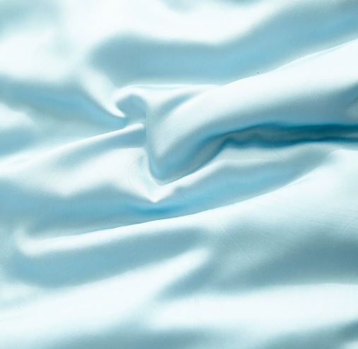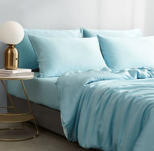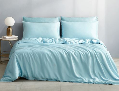 Blue Sky silk 4-piece bedding set. Soft, smooth, and luxurious bed linen for a calming and elegant bedroom experience.