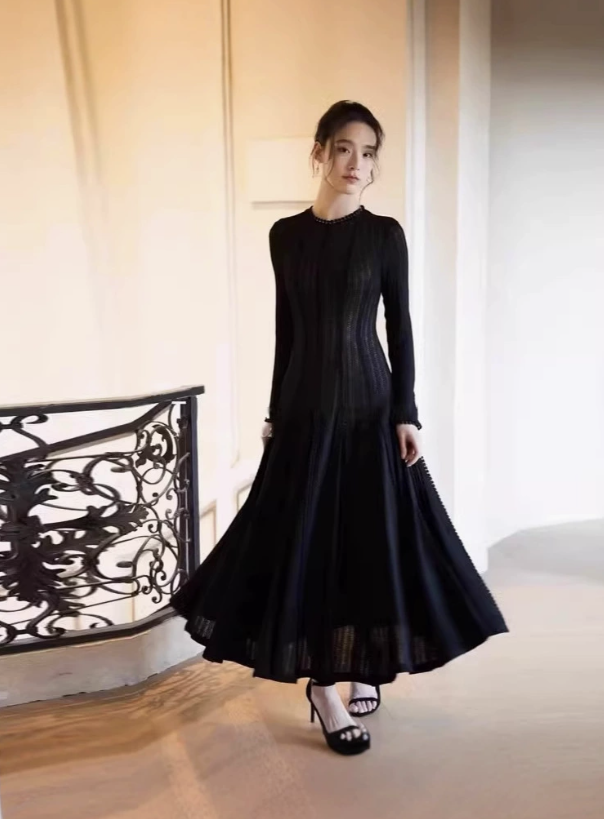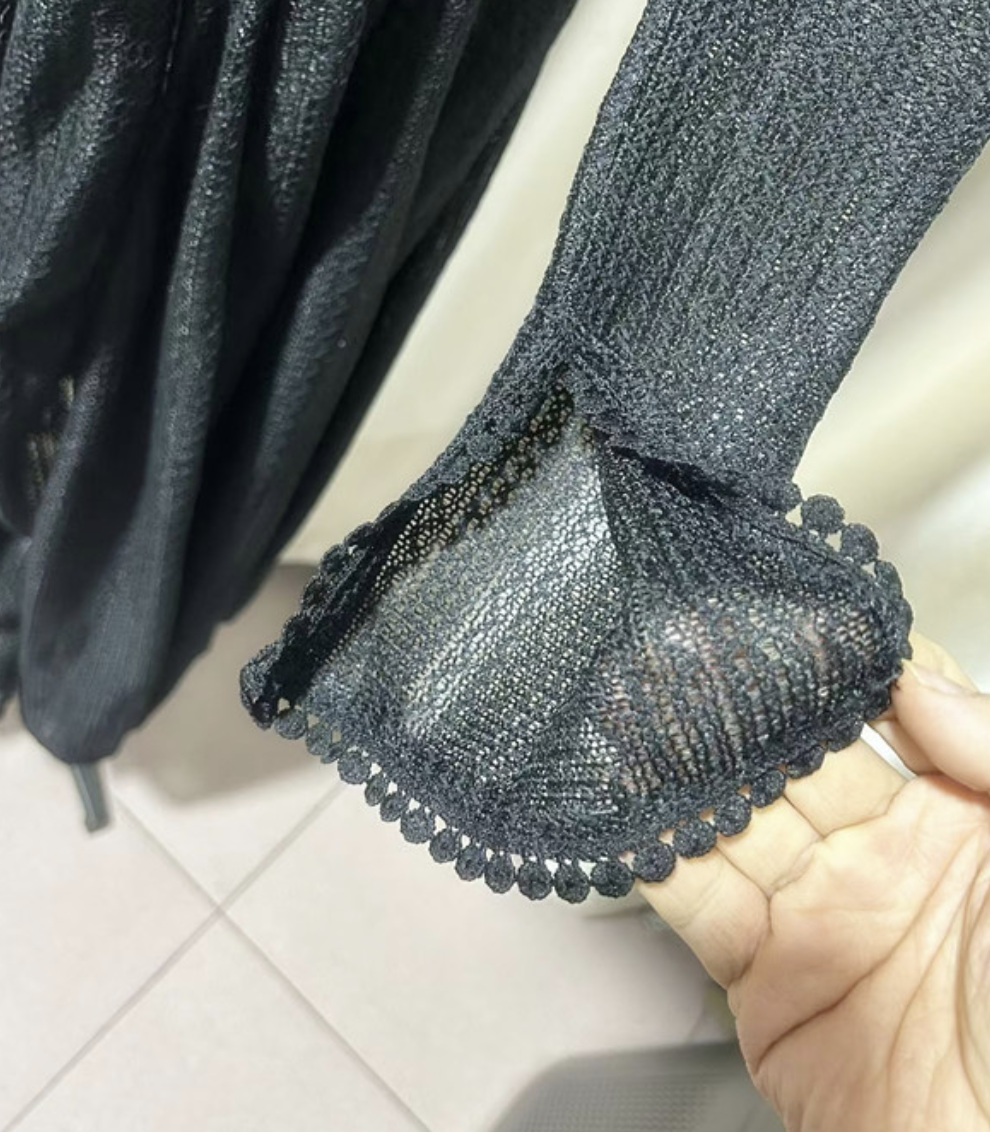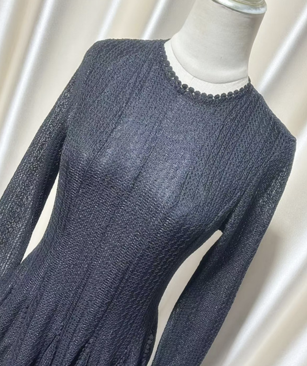 This elegant evening dress features long sleeves and intricate lace detailing, crafted from high-quality polyester fiber for a soft, lightweight, and comfortable fit. The lace adds a refined and feminine touch, making it ideal for formal events, parties, or romantic dinners.
