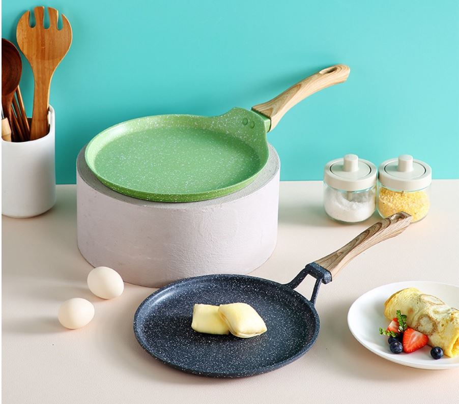 Durable thousand-layer non-stick frying pan made from stainless steel and aluminum alloy for even cooking and easy cleaning. Available in Green or Black with multiple size options for everyday kitchen use.