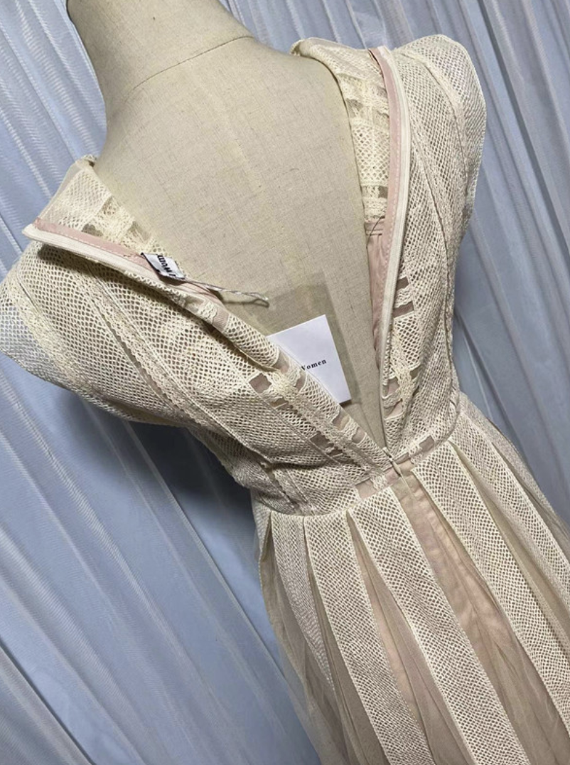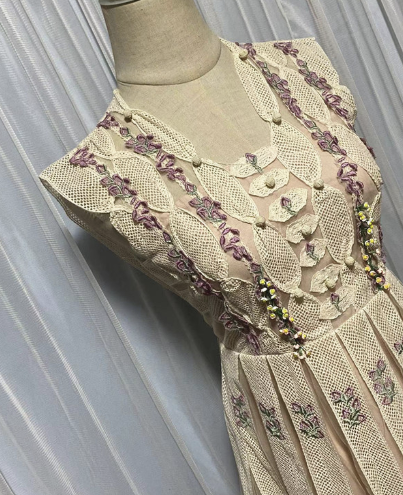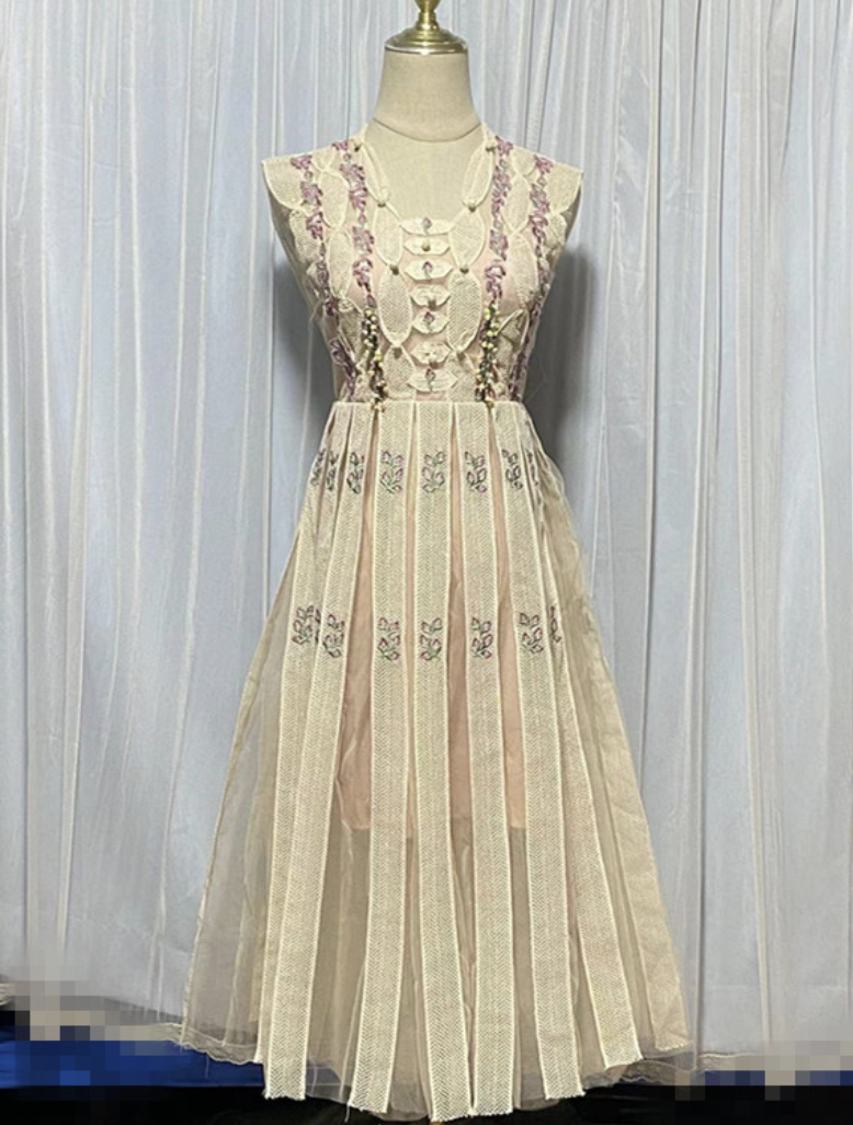 This sophisticated dress features a V-neckline and sleeveless design, adorned with delicate floral embroidery and beaded detailing. Made from high-quality polyester fiber, it is soft, lightweight, and comfortable, perfect for formal events, parties, or special occasions.