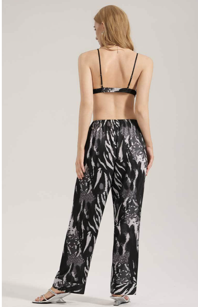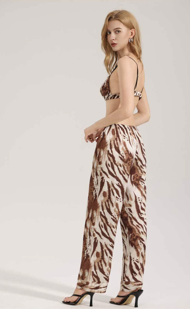 The elegant drape of satin chiffon enhances the natural flow of the design, while the zebra print adds a bold and fashionable touch. Perfect for sleepwear or lounging in style, this set balances comfort with statement-making appeal.